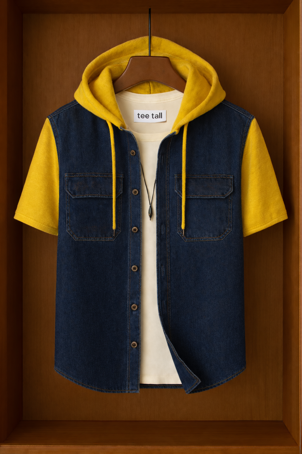 Mens Button Up Cotton Chambray Denim Hooded Full Sleeve Shirt TTMBUS169 - Blue